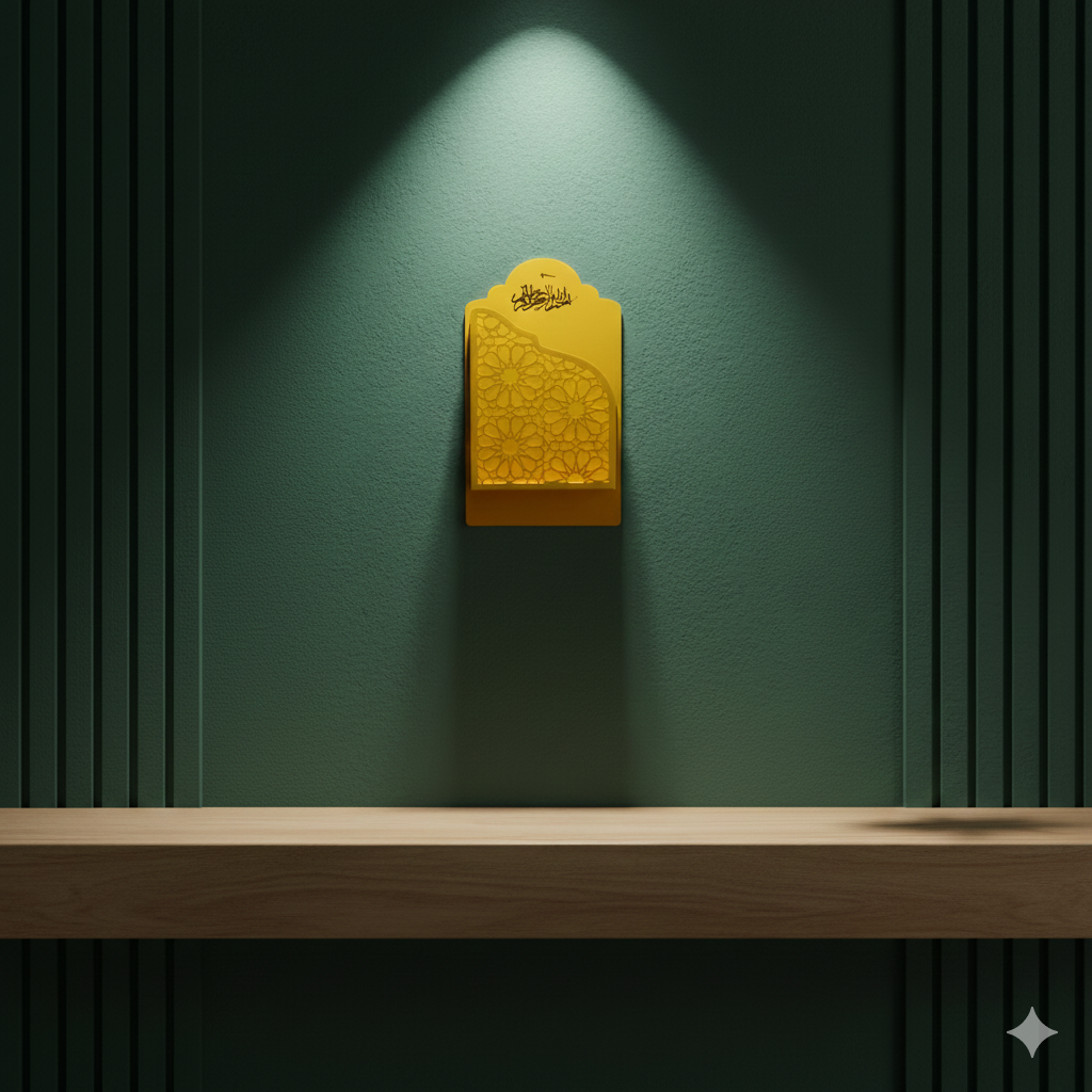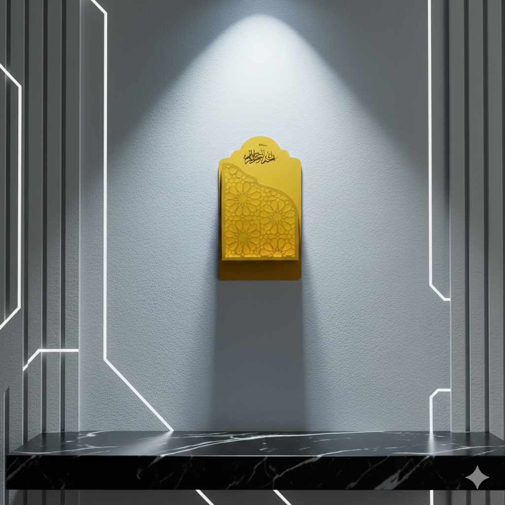 Made from high-quality durable metal, this holder features intricate Islamic geometric and floral patterns that give it a regal and timeless look. At the top, the sacred phrase “Bismillah” is delicately inscribed in Arabic calligraphy, adding a deep spiritual and meaningful touch to the design.